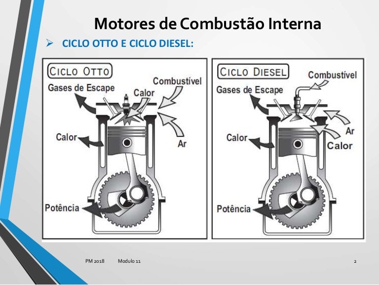 4 Etapas de Funcionamento de um motor tipo Otto. Fonte: Wikipedia. Acesso Jun/09. Ao lado temos uma animação dos 4 ciclos de um motor quatro tempos em funcionamento. As máquinas à combustão interna do tipo Otto e Diesel, inventadas no final do século XIX, são compostas de no mínimo um cilindro, contendo um êmbolo móvel (pistão) e.