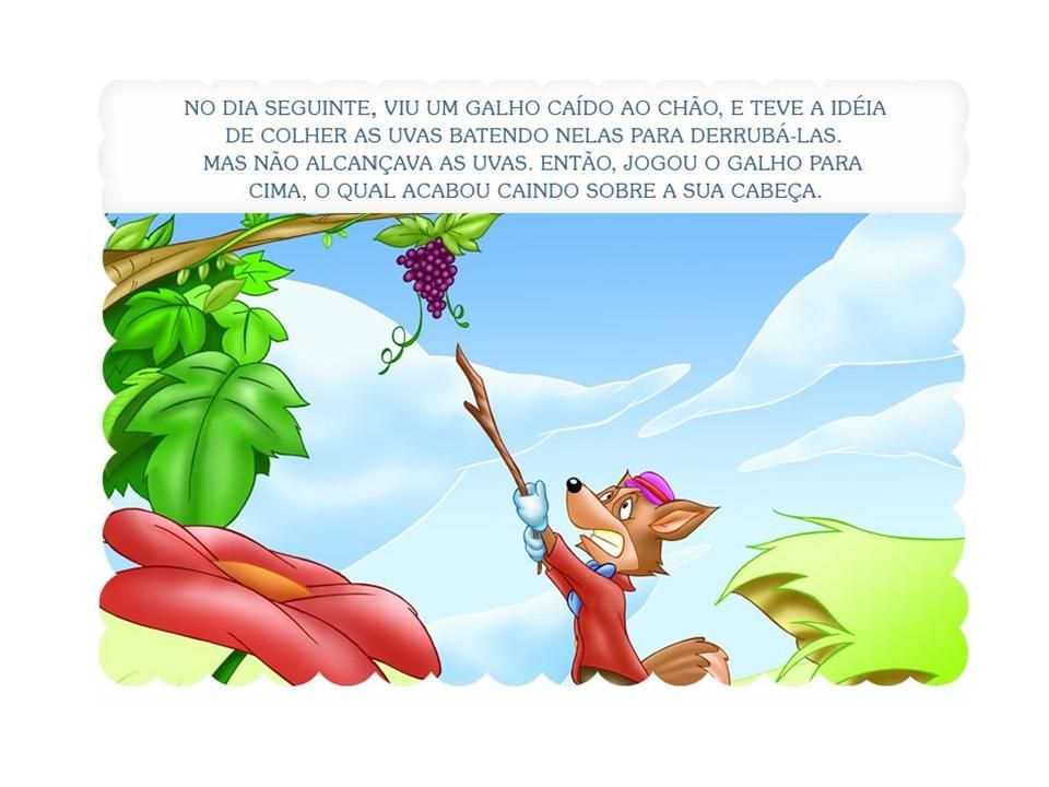 contos abr 8, 2020. Uma raposa estava com muita fome. Foi quando viu uma parreira cheia de lindos cachos de uva. Imediatamente começou a dar pulos para ver se pegava as uvas. Mas a ela era muito alta e, por mais que pulasse, a raposa não as alcançava. — Estão verdes — disse, com ar de desprezo. E já ia seguindo o seu caminho, quando.