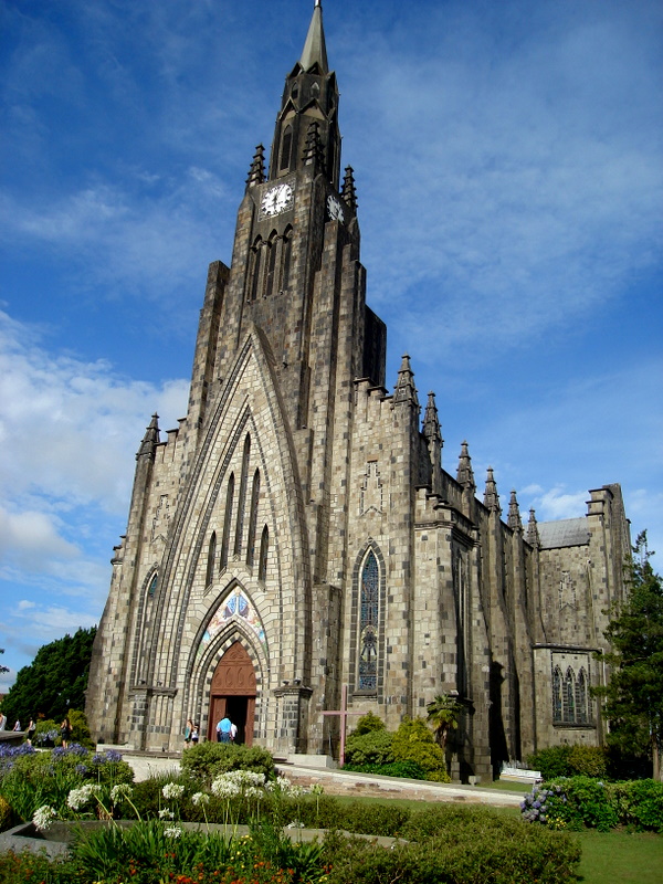 Catedral de Pedra. Brazil, South America. Top choice in Rio Grande do Sul. Bigger and more dramatic than Gramado's stone church, this English Gothic stone cathedral dominates Canela's main square. The church features a 65m-high tower and a carillon of 12 bells made of Italian bronze as well as a Last Supper-themed altar carved in wood by.