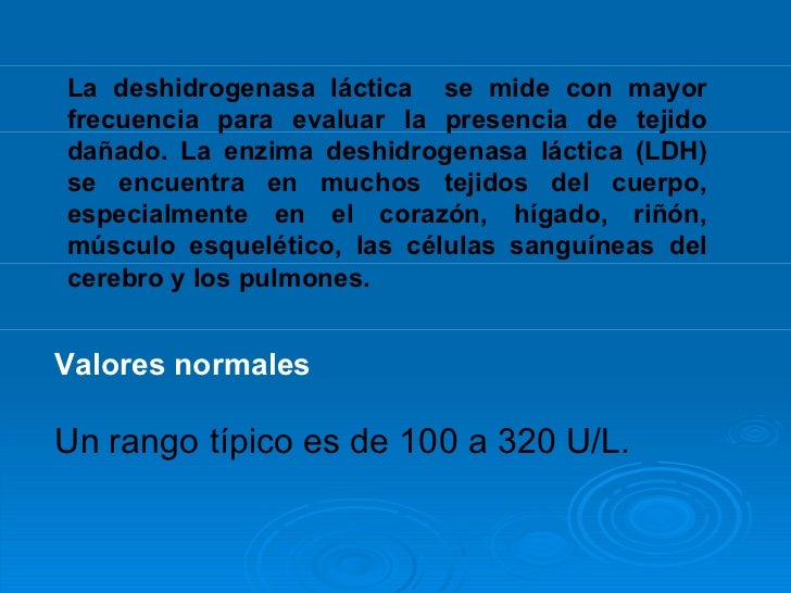 Los valores normales de la lactato deshidrogenasa pueden variar según el laboratorio, y normalmente se consideran entre 120 e 246 UI/L en los adultos. 1. Deshidrogenasa láctica alta. El aumento del LDH normalmente indica lesión en órganos o tejidos. Esto se debe como consecuencia al daño celular, el LDH contenido dentro de las células es.