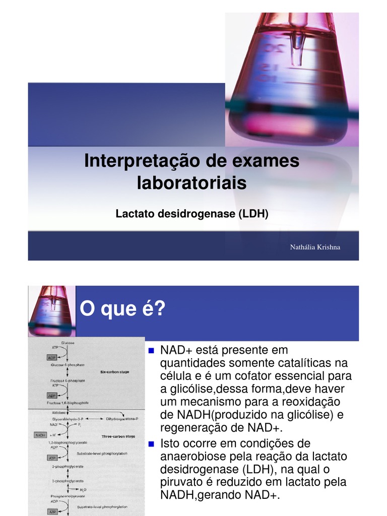O LDH, também chamado de desidrogenase láctica ou lactato desidrogenase, é uma enzima presente dentro das células responsável pelo metabolismo da glicose no organismo. A alteração nos níveis de LDH podem indicar a presença de doenças agudas ou crônicas que devem ser avaliadas pelo médico. Essa enzima pode ser encontrada em diversos.