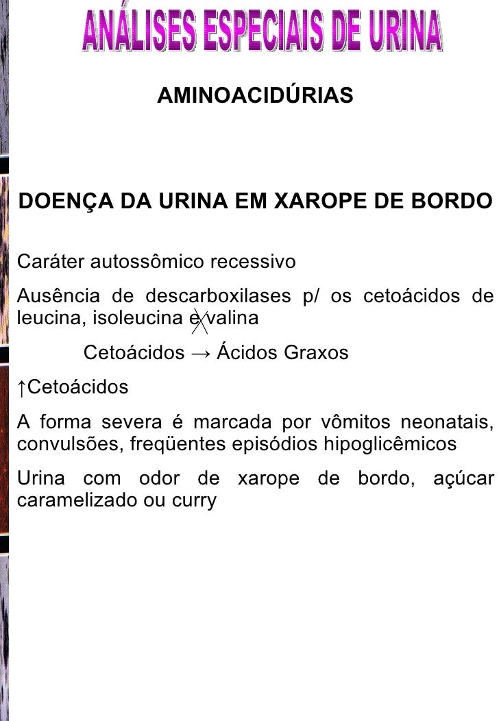 Doença da urina xarope de bordo. Comentário. é caracterizada por um agravamento progressivo até ao estado de coma profundo associada ao cheiro característico da urina (xarope de bordo - caramelo). A forma sub-aguda, de início um pouco mais tardio, apresenta-se clinicamente como uma encefalopatia com atraso mental, hipotonia grave.