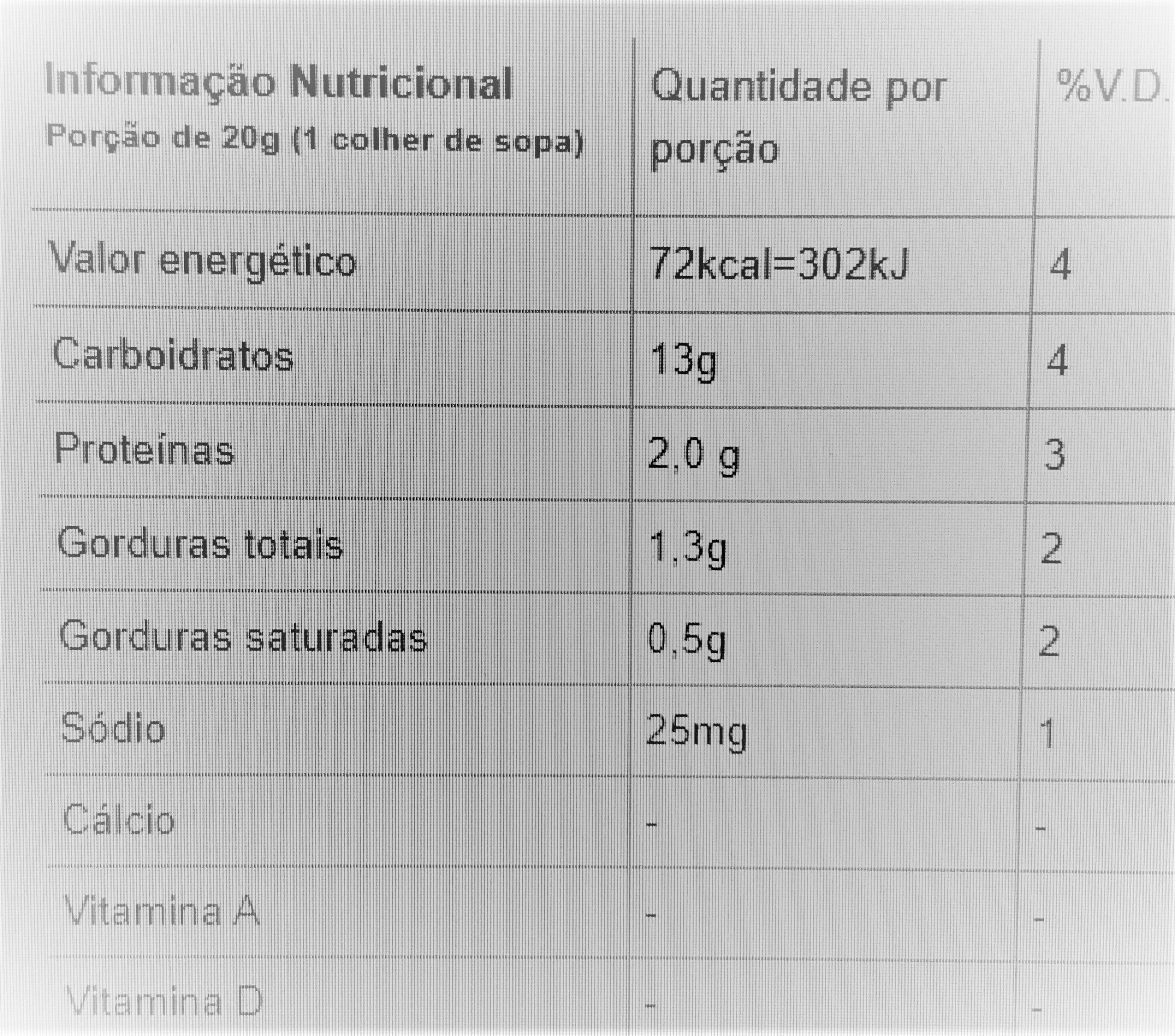 Componente Unidade (100.00 g) colher de sopa (19.00 g) Principais: Água: g: 28.71: 5.45: Valor energético (kcal) kcal: 315: 60: Proteína: g: 6.84: 1.3