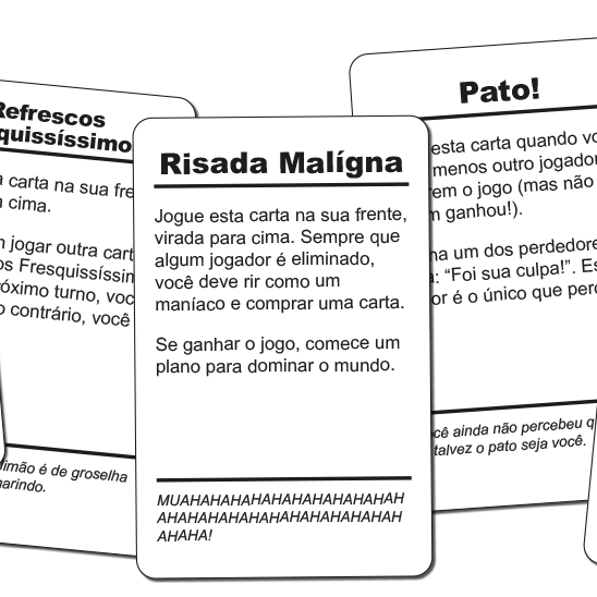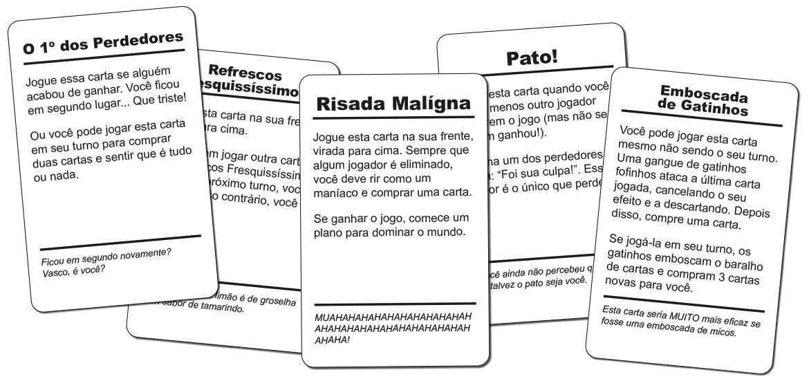 Nós Não Testamos Este Troço. Uma tradução do jogo original We Didn't Playtest This Game! O objetivo do jogo é vencer! Se você perder, você não ganhou, e você está de fato fora do jogo. Se todo mundo exceto você perdeu, você ganha! Para começar o, embaralhe todas as cartas juntas e dê duas para cada jogador. Escolha alguém para.