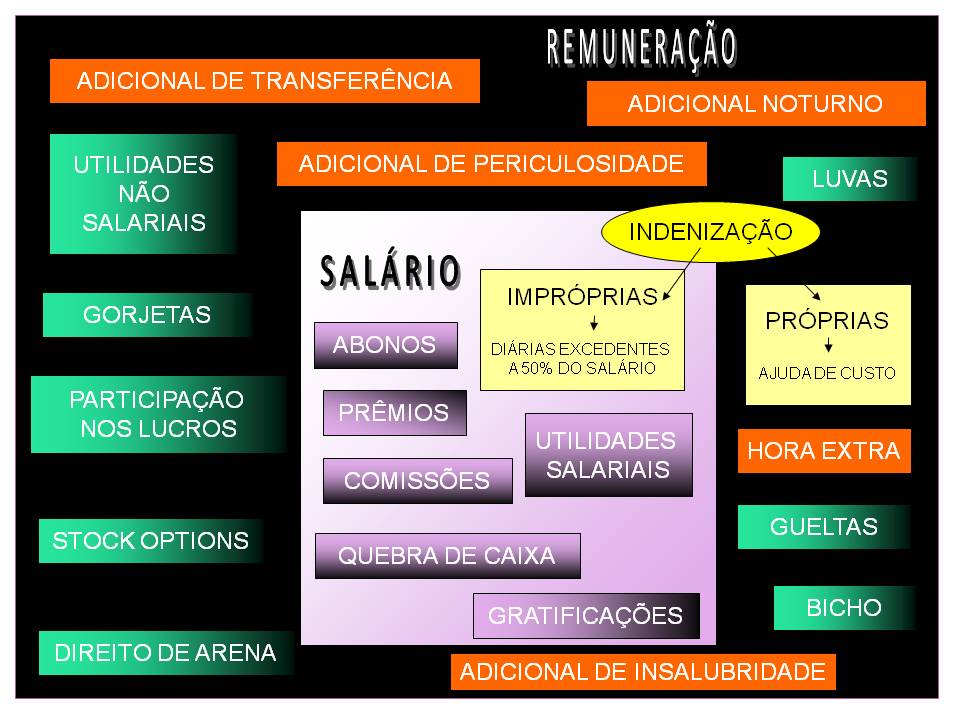 O salário é um pagamento mediante a um acordo entre contratante e contratado e ele não pode ser reduzido abaixo do mínimo permitido por lei. Já as remunerações tem caráter mais variável, podendo variar de acordo com desempenho, ou características do trabalho, como insalubridade e atividades noturnas. É interessante ressaltar aqui.