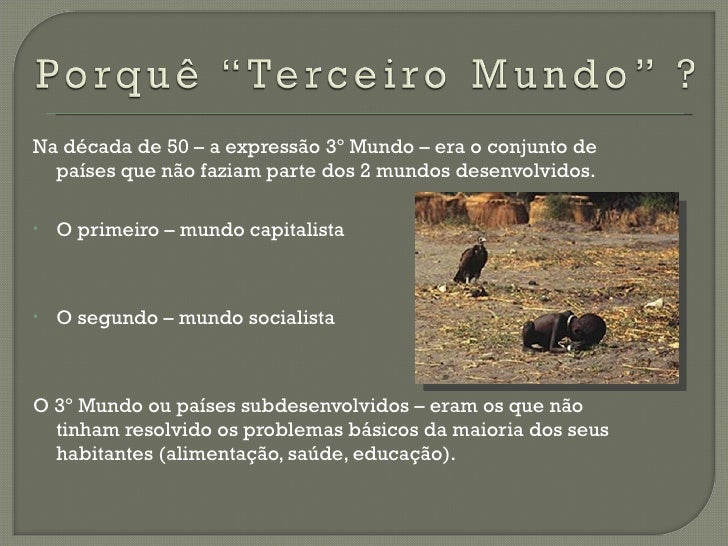 Terceiro mundo. Terceiro mundo é uma expressão usada para designar os países que dispõem de uma economia subdesenvolvida ou em desenvolvimento. Essa expressão surgiu na época da Guerra Fria, remetendo aos países que não se encontravam nem do lado dos EUA nem da URSS, os denominados "não - alinhados". O terceiro mundo compreende.
