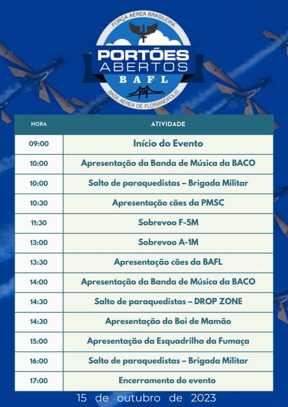 Venha participar dos Portões Abertos da Base Aérea de Florianópolis, basta adquirir seu ingresso de forma gratuita no link abaixo. E lembre-se: a entrada na Guarnição de Aeronáutica de Florianópolis só será permitida para as pessoas que portarem o ticket/ingresso. Os Portões Abertos 2023 - BAFL, acontecerá no dia 15 de Outubro de 2023.