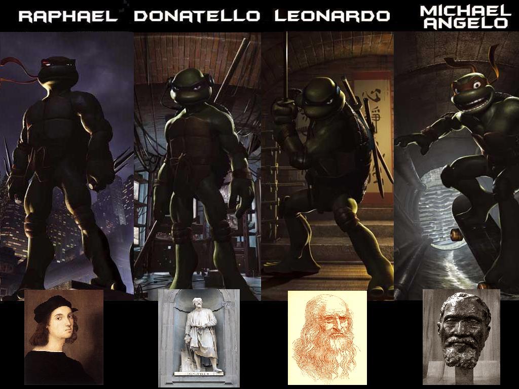 A explicação dos criadores para os nomes das Tartarugas Ninja, foi que eles tentaram nomes japoneses, mas o dos mestres do renascimento "encaixaram melhor"; Splinter tem origens variadas na história. Por exemplo: originalmente ele era um rato, com Hamato Yoshi sendo seu dono e assassinado por Oroku Saki/Destruidor.